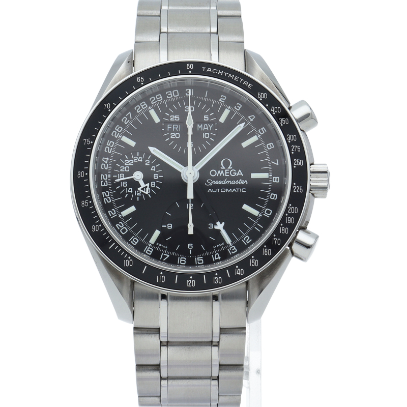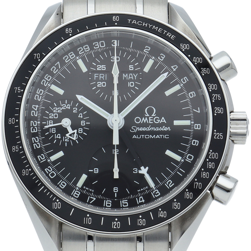 オメガの人気「スピードマスター」。クロノグラフ、月・日・曜日表示機能がついた便利な多機能ウォッチ。スタイルを選ばずにご使用いただける便利な1本。