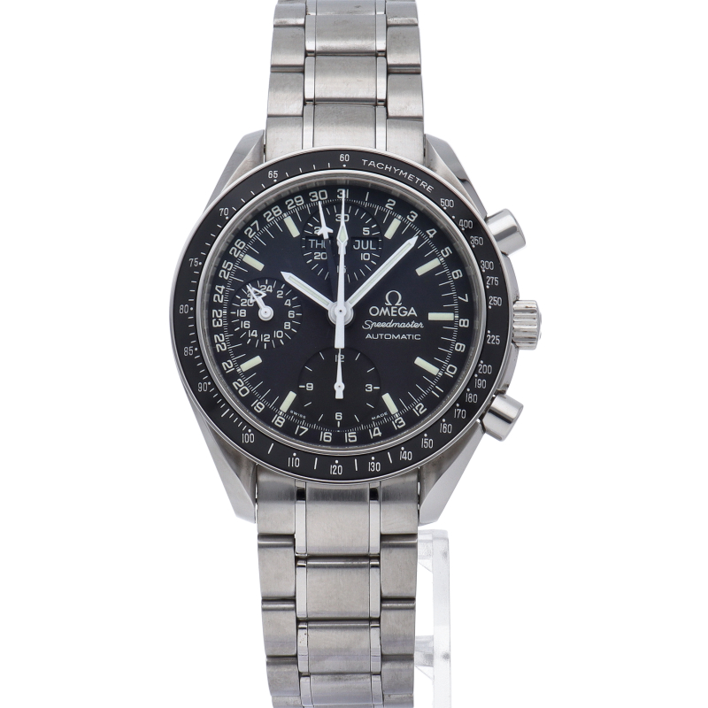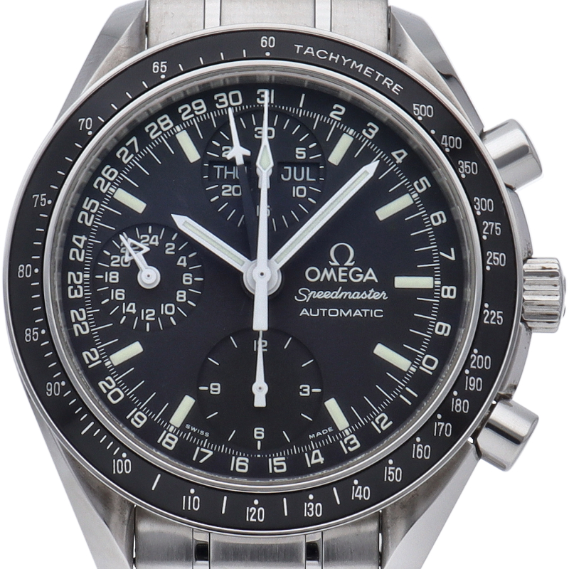 オメガの人気「スピードマスター」。クロノグラフ、月・日・曜日表示機能がついた便利な多機能ウォッチ。スタイルを選ばずにご使用いただける便利な1本。