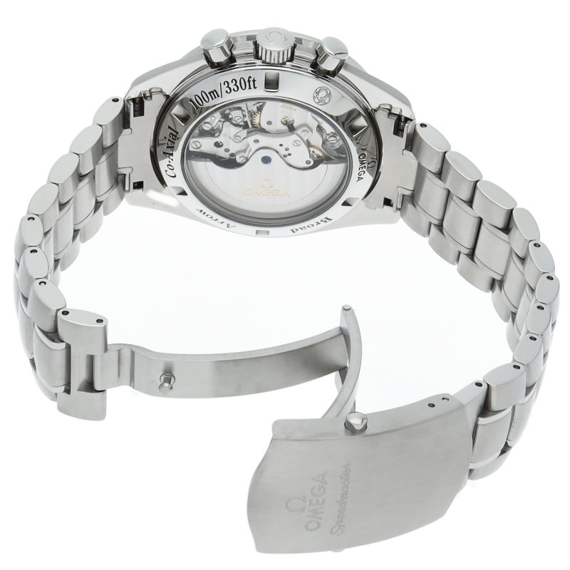 オメガのスピードマスター生誕50周年記念モデルです。シースルーバックになっており、コーアクシャルムーブメントを堪能できます。ブロードアロー針を採用。