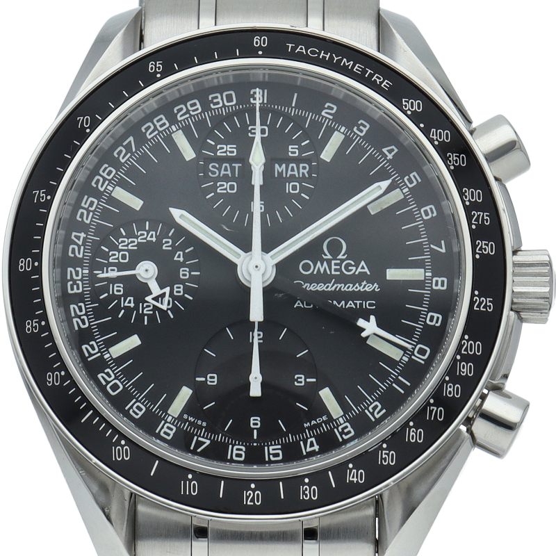 オメガの人気「スピードマスター」。クロノグラフ、月・日・曜日表示機能がついた便利な多機能ウォッチ。スタイルを選ばずにご使用いただける便利な1本。