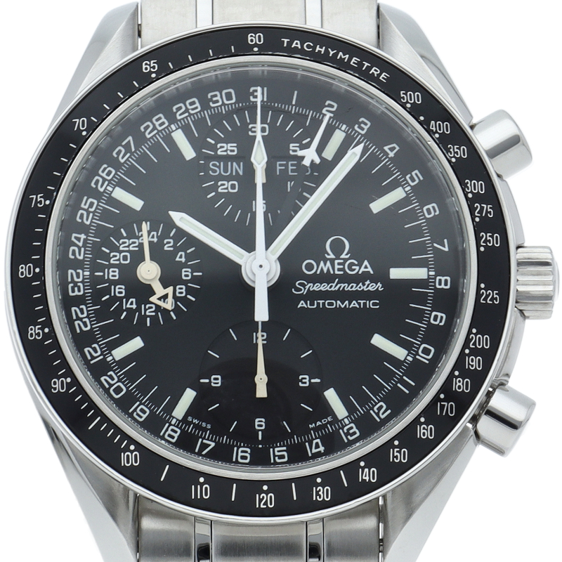 オメガの人気「スピードマスター」。クロノグラフ、月・日・曜日表示機能がついた便利な多機能ウォッチ。スタイルを選ばずにご使用いただける便利な1本。