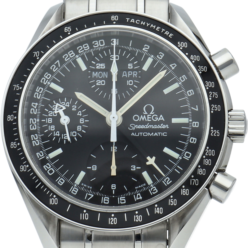 オメガの人気「スピードマスター」。クロノグラフ、月・日・曜日表示機能がついた便利な多機能ウォッチ。スタイルを選ばずにご使用いただける便利な1本。