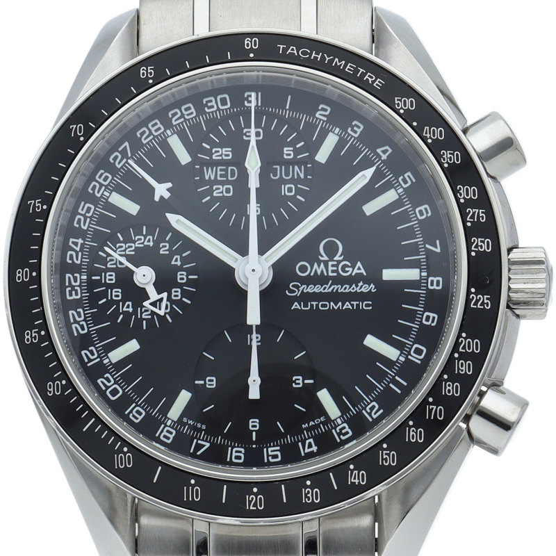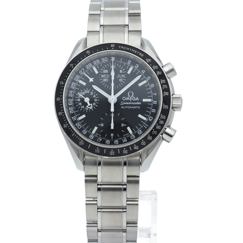 オメガの人気「スピードマスター」。クロノグラフ、月・日・曜日表示機能がついた便利な多機能ウォッチ。スタイルを選ばずにご使用いただける便利な1本。