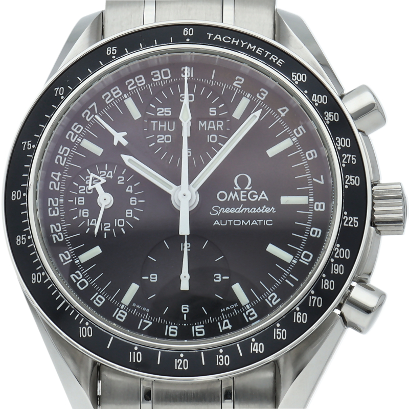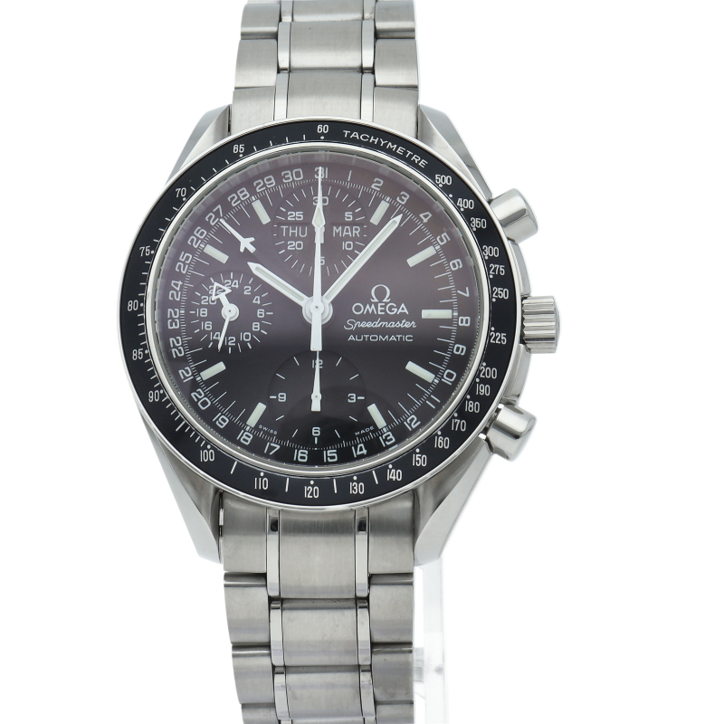 オメガの人気「スピードマスター」。クロノグラフ、月・日・曜日表示機能がついた便利な多機能ウォッチ。スタイルを選ばずにご使用いただける便利な1本。