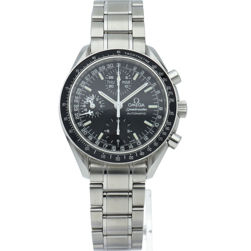 オメガの人気「スピードマスター」。クロノグラフ、月・日・曜日表示機能がついた便利な多機能ウォッチ。スタイルを選ばずにご使用いただける便利な1本。