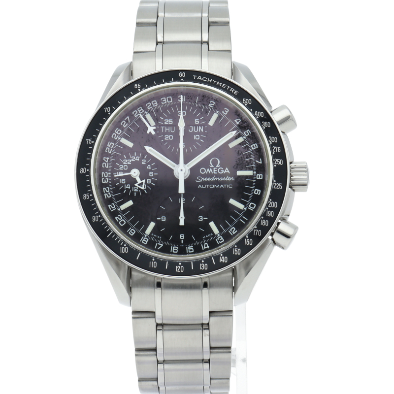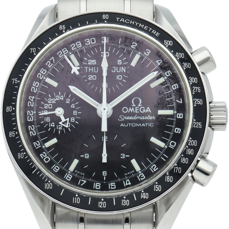 オメガの人気「スピードマスター」。クロノグラフ、月・日・曜日表示機能がついた便利な多機能ウォッチ。スタイルを選ばずにご使用いただける便利な1本。