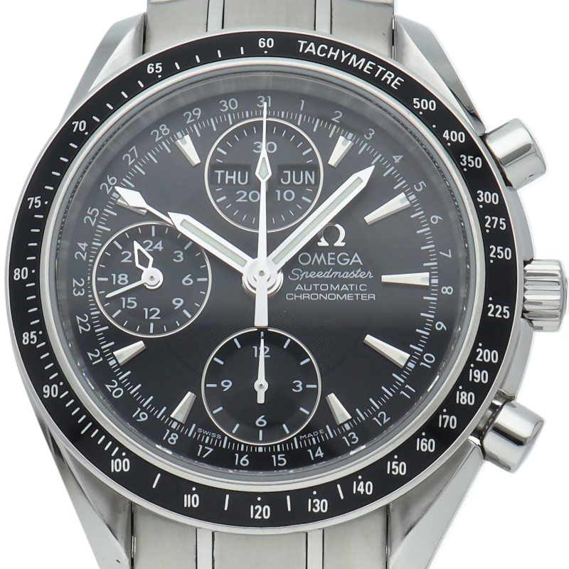 オメガの人気「スピードマスター」。クロノグラフ、月・日・曜日表示機能がついた便利な多機能ウォッチ。モデルチェンジに伴い高級感がアップした1本。