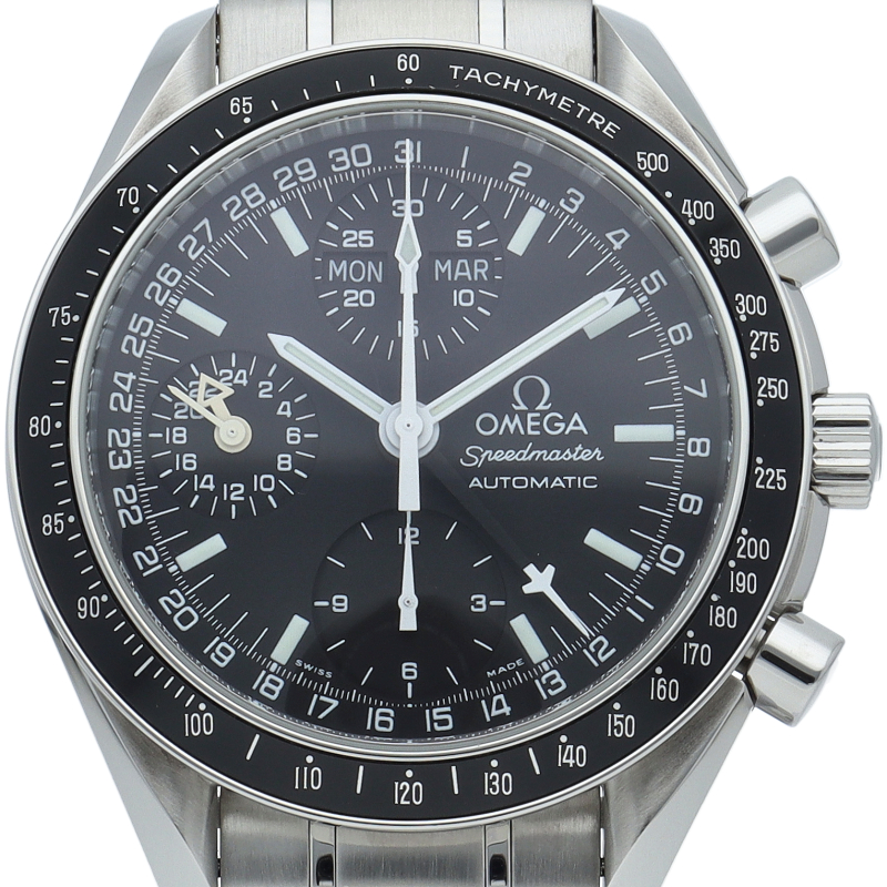 オメガの人気「スピードマスター」。クロノグラフ、月・日・曜日表示機能がついた便利な多機能ウォッチ。スタイルを選ばずにご使用いただける便利な1本。
