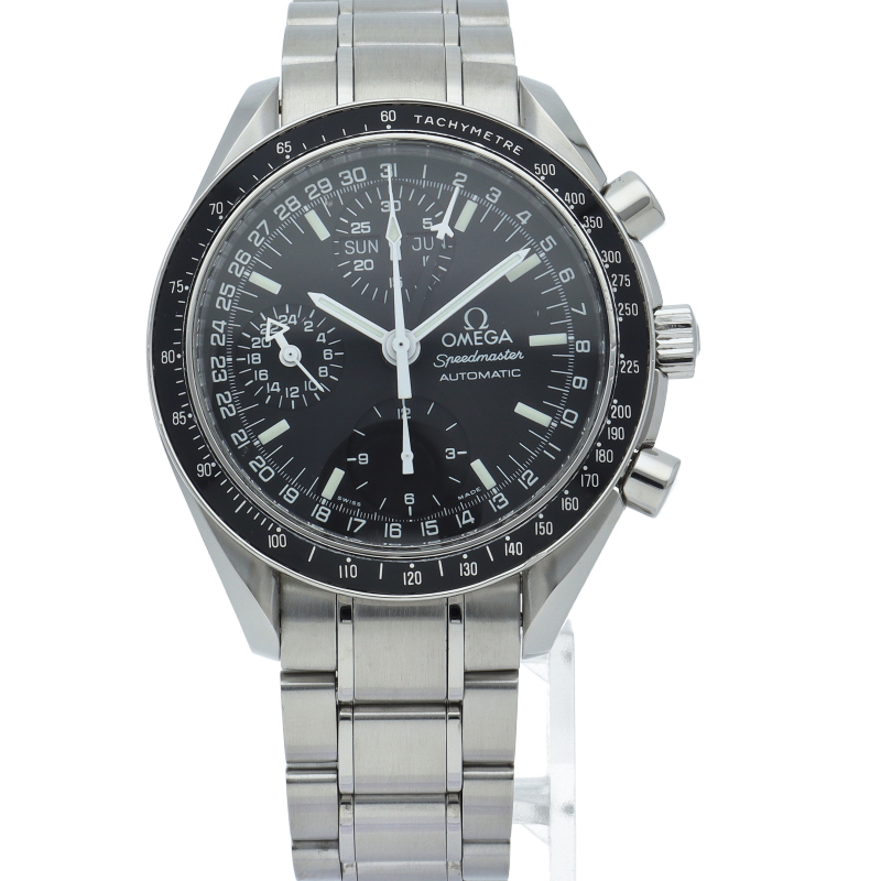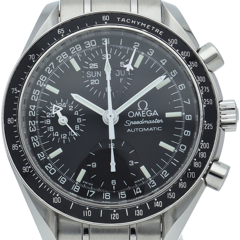 オメガの人気「スピードマスター」。クロノグラフ、月・日・曜日表示機能がついた便利な多機能ウォッチ。スタイルを選ばずにご使用いただける便利な1本。