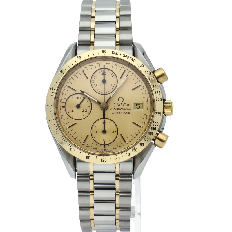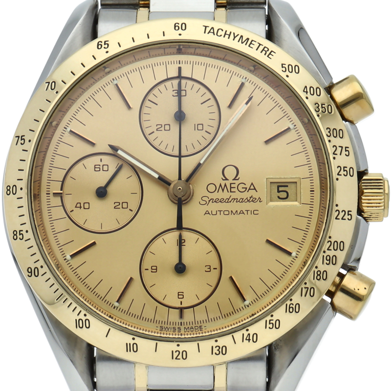 オメガの代表的な人気シリーズ「スピードマスターデイト」。クロノグラフ・デイト表示機能付きと便利で実用性のある1本です。