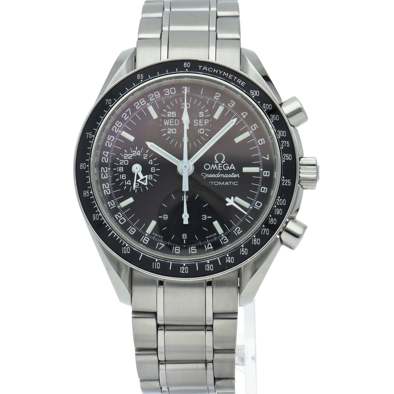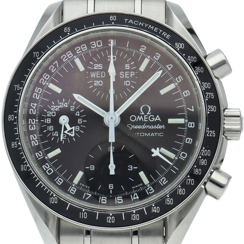 オメガの人気「スピードマスター」。クロノグラフ、月・日・曜日表示機能がついた便利な多機能ウォッチ。スタイルを選ばずにご使用いただける便利な1本。