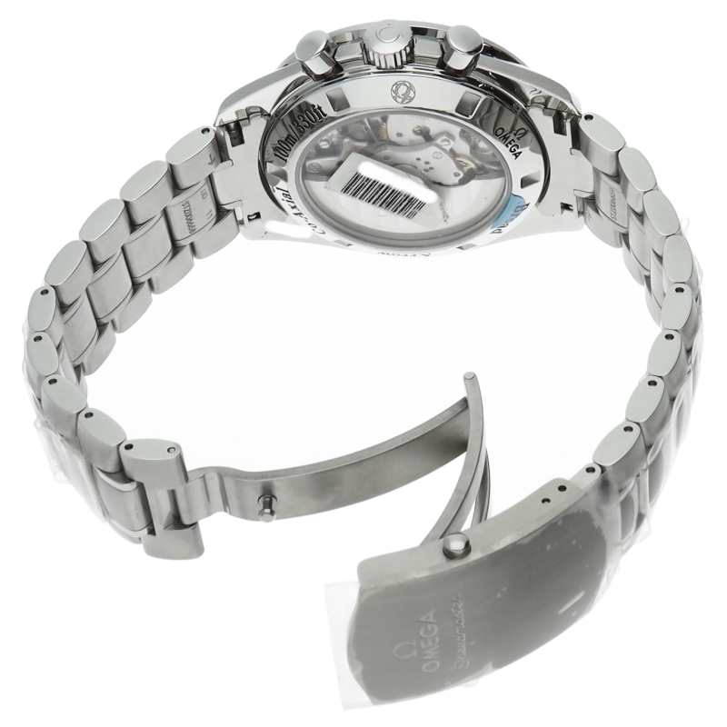 オメガのスピードマスター生誕50周年記念モデルです。シースルーバックになっており、コーアクシャルムーブメントを堪能できます。ブロードアロー針を採用。