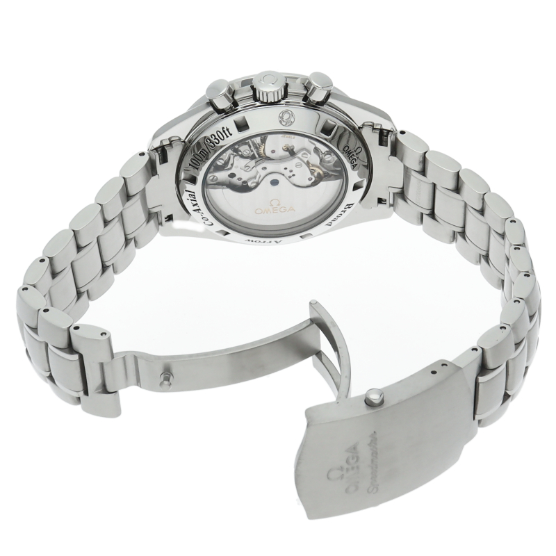 オメガのスピードマスター生誕50周年記念モデルです。シースルーバックになっており、コーアクシャルムーブメントを堪能できます。ブロードアロー針を採用。