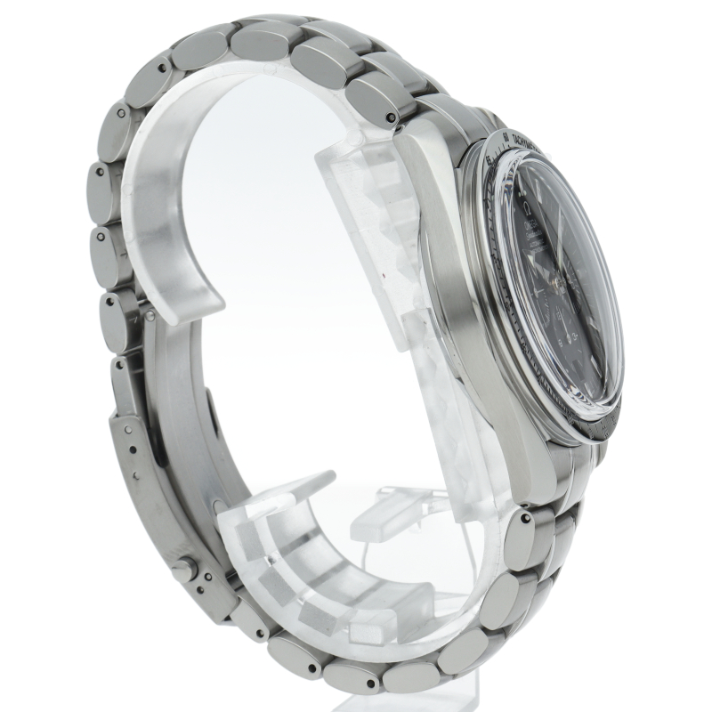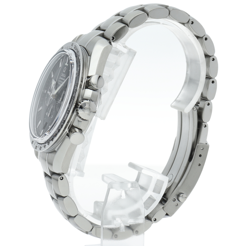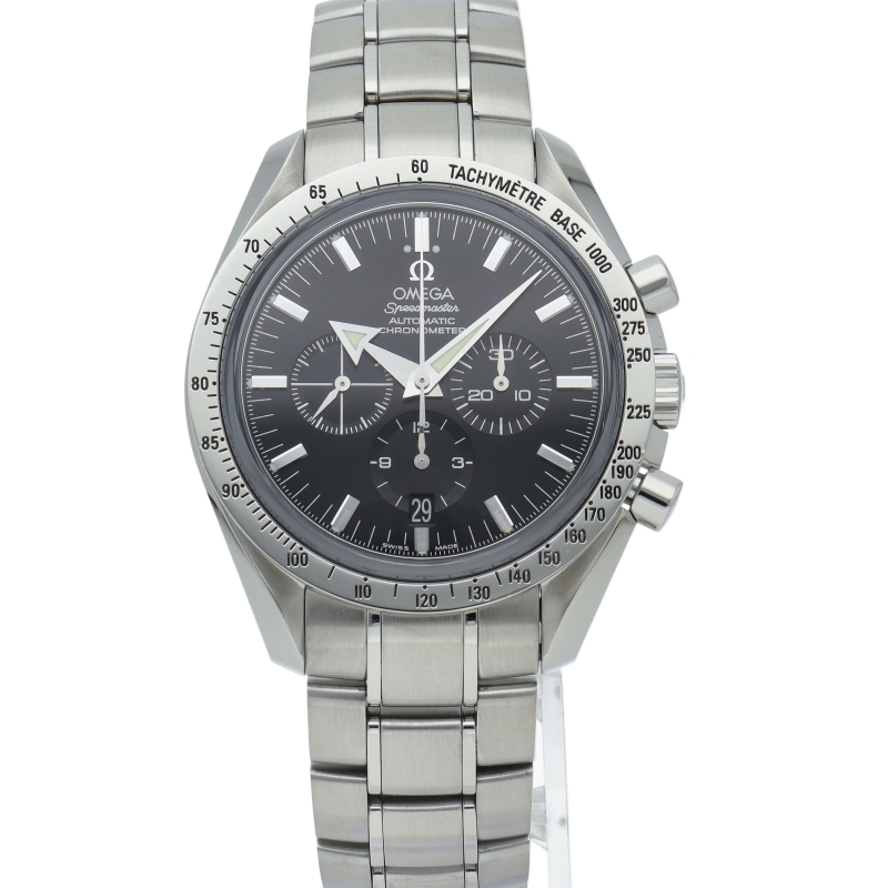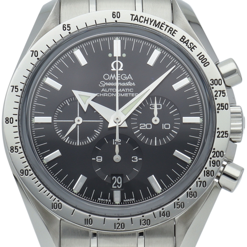 ファーストモデルを彷彿とさせる弓矢型の針「ブロードアロー」を採用したスピードマスターコラムホイール機構搭載の自動巻きクロノグラフ、オメガCal.3303を搭載した公式認定クロノメーター。
