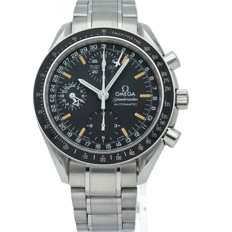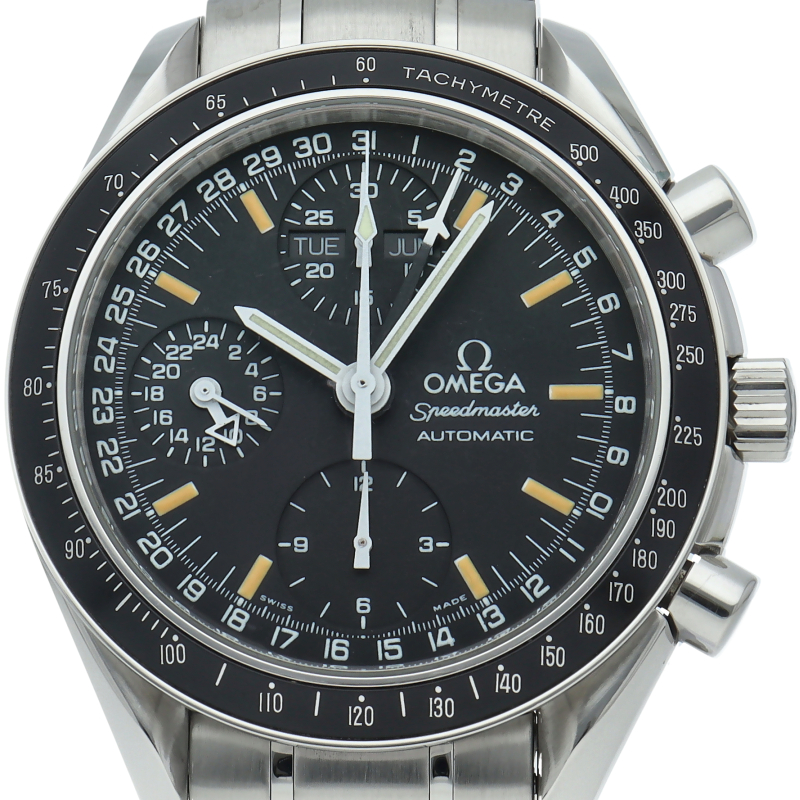 オメガの人気「スピードマスター」。クロノグラフ、月・日・曜日表示機能がついた便利な多機能ウォッチ。スタイルを選ばずにご使用いただける便利な1本。