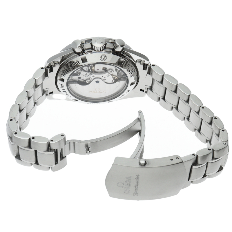 オメガのスピードマスター生誕50周年記念モデルです。シースルーバックになっており、コーアクシャルムーブメントを堪能できます。ブロードアロー針を採用。