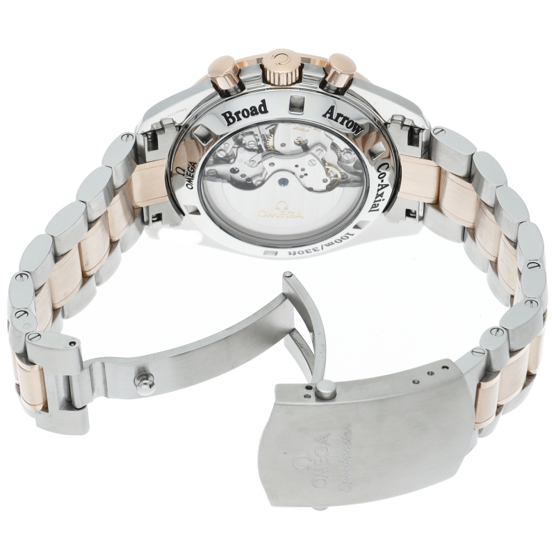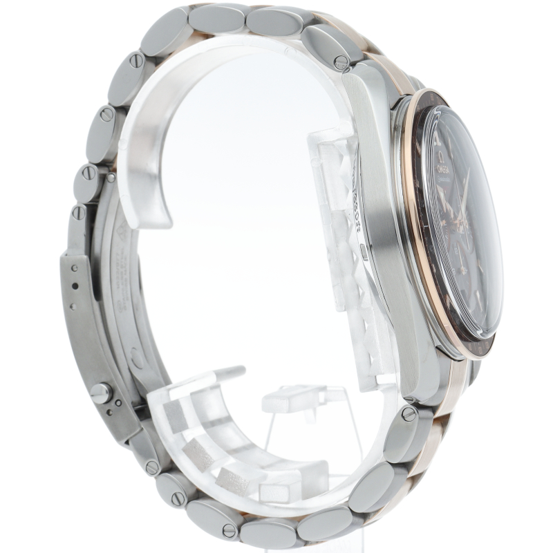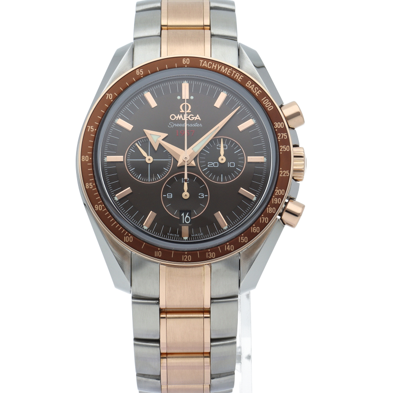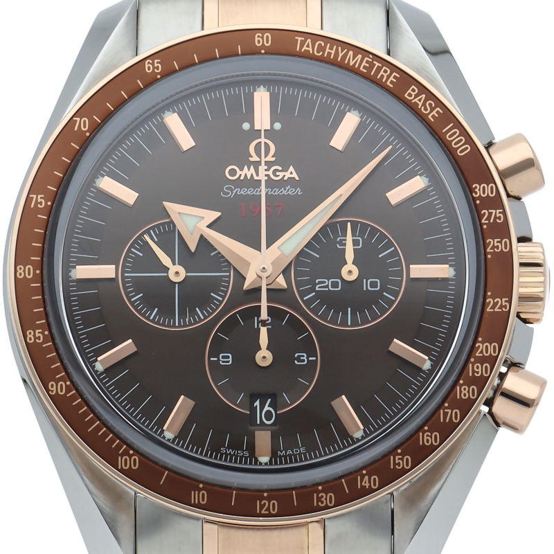 オメガのスピードマスター生誕50周年記念モデルです。レッドゴールドとステンレスのコンビモデルで、ブラウンダイアルにはスピードマスター誕生年の1957が赤字でプリントされています。ムーブメントにはコーアクシャル・コラムホイール式クロノグラフムーブメントの3313が搭載されています。