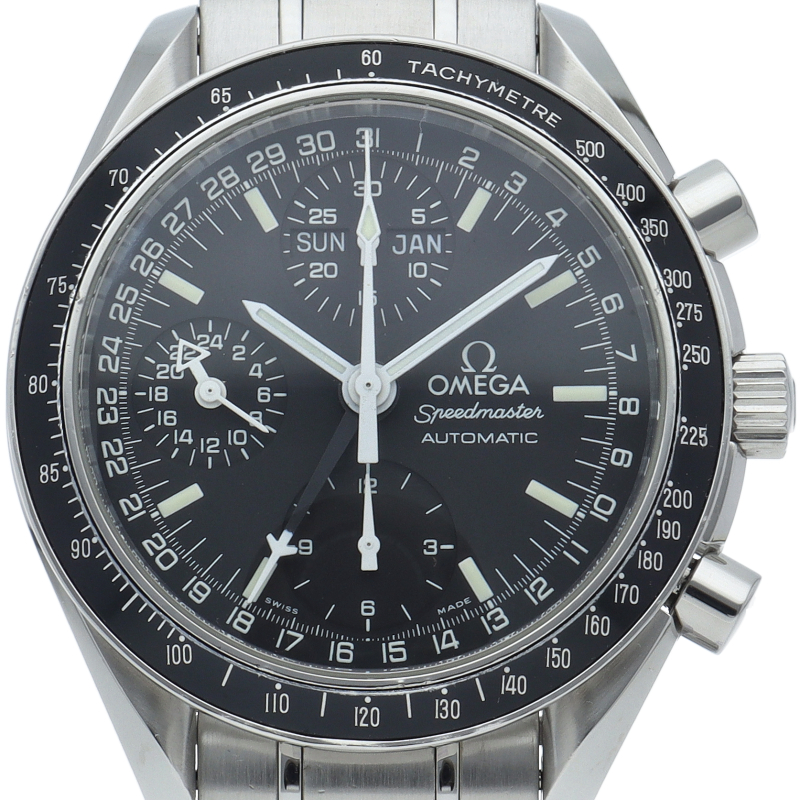 オメガの人気「スピードマスター」。クロノグラフ、月・日・曜日表示機能がついた便利な多機能ウォッチ。スタイルを選ばずにご使用いただける便利な1本。