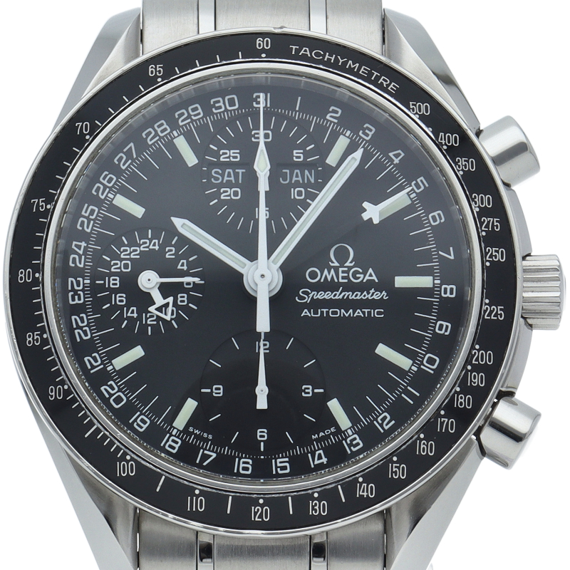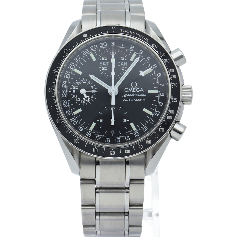 オメガの人気「スピードマスター」。クロノグラフ、月・日・曜日表示機能がついた便利な多機能ウォッチ。スタイルを選ばずにご使用いただける便利な1本。