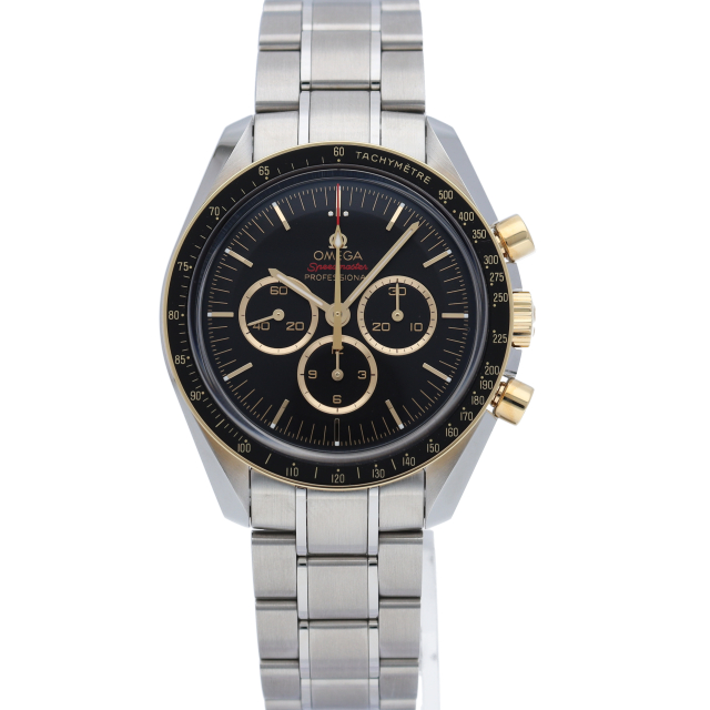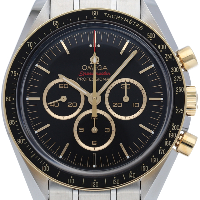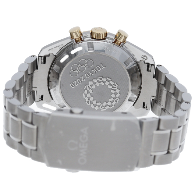 2020年オリンピック 東京大会の開催まで2年を切ったこと祝し、大会のオフィシャルタイムキーパーであるオメガは、2,020本限定の「スピードマスター」を製作しました。18Kイエローゴールドは、オメガのロゴ、針、面取りを施したアプライドインデックス、ブラックのダイアルに配された3つのサブダイアルのリングにも使用されています。ミニッツトラックもイエローゴールドカラーです。