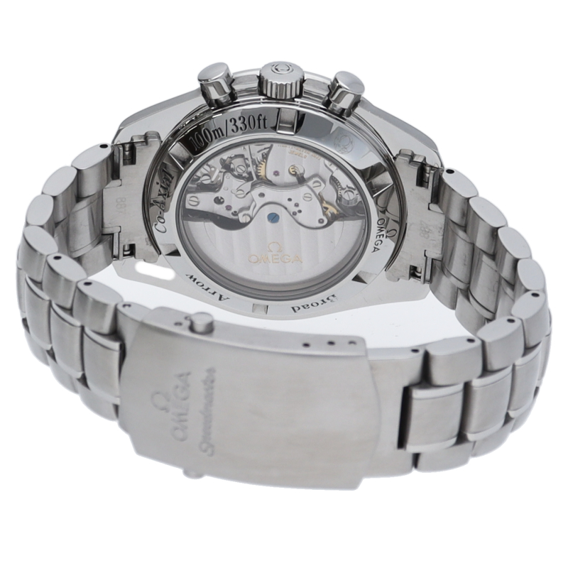 オメガのスピードマスター生誕50周年記念モデルです。シースルーバックになっており、コーアクシャルムーブメントを堪能できます。ブロードアロー針を採用。