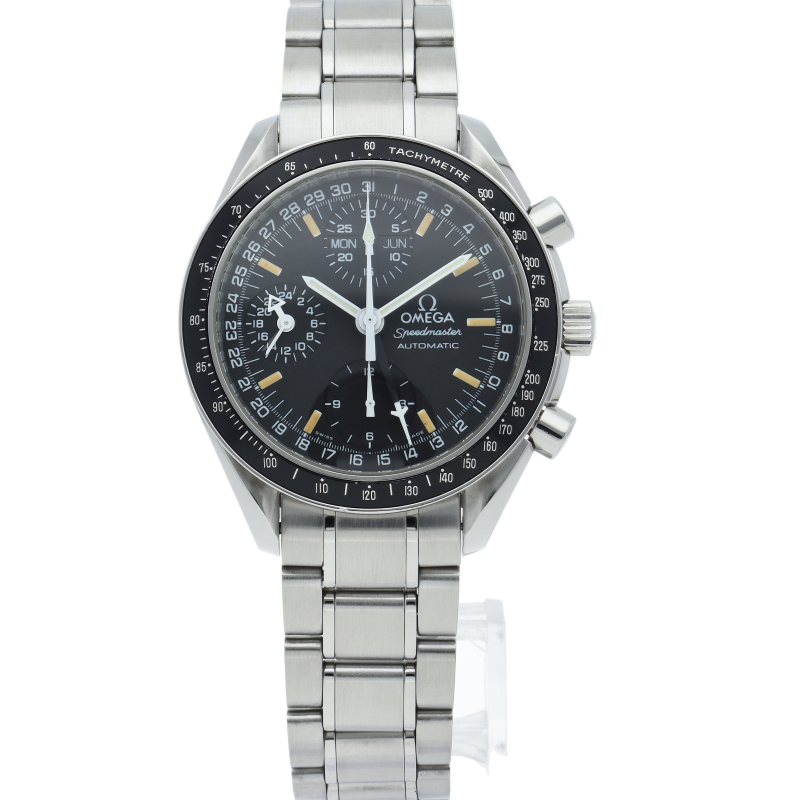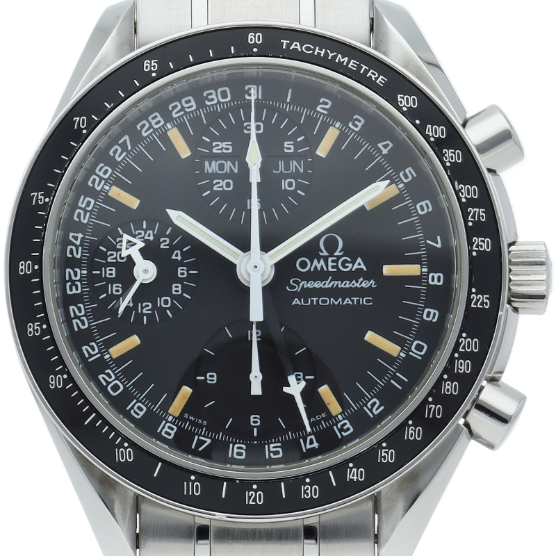 オメガの人気「スピードマスター」。クロノグラフ、月・日・曜日表示機能がついた便利な多機能ウォッチ。スタイルを選ばずにご使用いただける便利な1本。