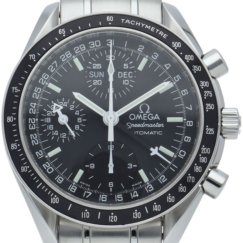 オメガの人気「スピードマスター」。クロノグラフ、月・日・曜日表示機能がついた便利な多機能ウォッチ。スタイルを選ばずにご使用いただける便利な1本。