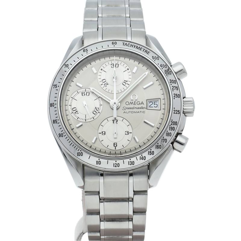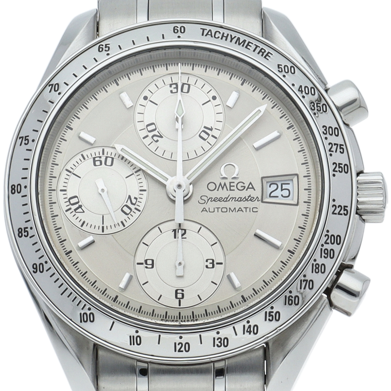 オメガの代表的な人気シリーズ「スピードマスター・デイト」。クロノグラフ・デイト表示機能付きと便利で実用性のある1本です。