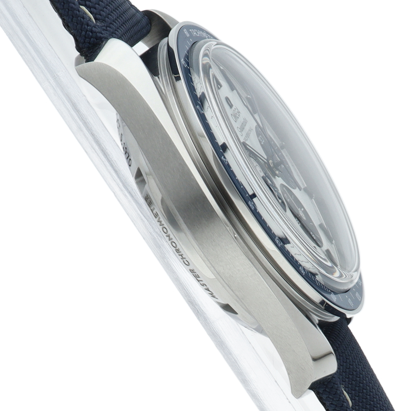 1970年にNASAの宇宙飛行士から贈られた「シルバー スヌーピー アワード」の50周年記念モデルとして作られました。司令機械船に乗ったスヌーピーが、クロノグラフ機能が使用されると回転するマジックハンドにあしらわれています。裏側には地球をかたどったディスクもあり、時計のスモールセコンドに連動して1分間に1回転します。