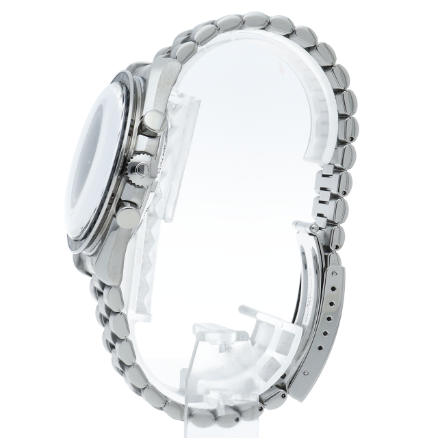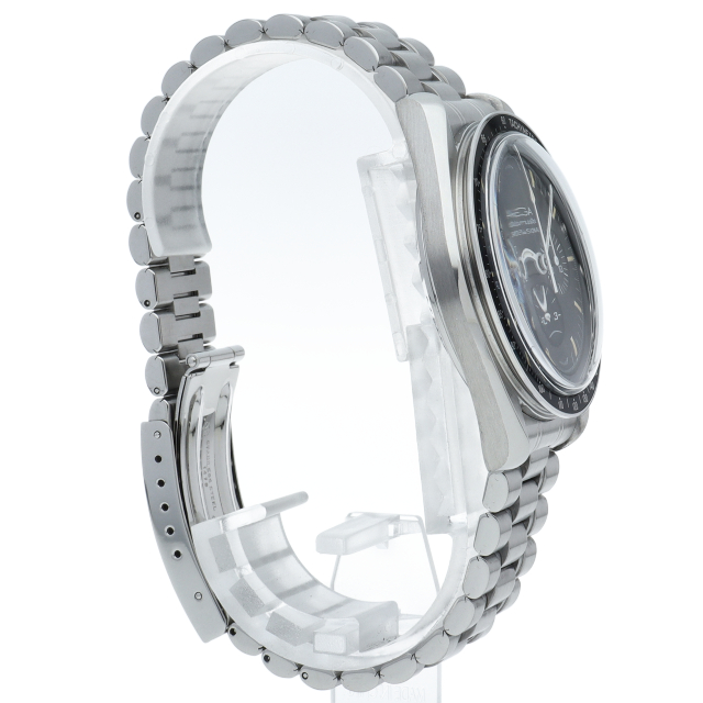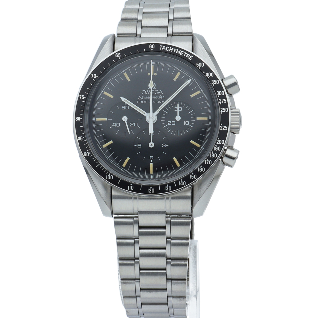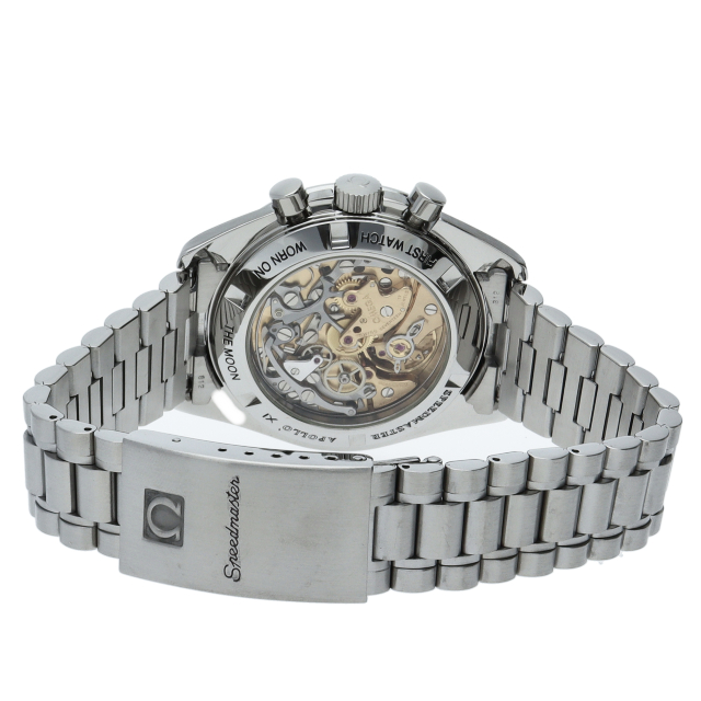 ザ・ムーンウォッチ「スピードマスター プロフェッショナル」。1996年よりRef.3570-50で親しまれたプラスチック風防のスピードマスターですが、このオメガを代表する人気モデルでムーンウォッチとしても有名な1本。シースルーバックから覗ける手巻ムーブメントが特徴的な1本。初期モデルにのみ搭載された金メッキのムーブメントを搭載しております。トリチウム文字盤。Cal.863。