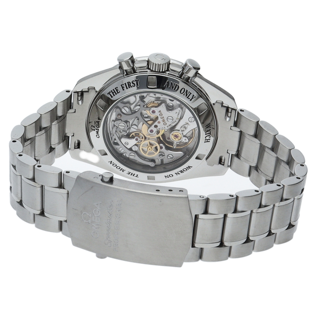 オメガを代表する人気モデルでムーンウォッチとしても有名な1本。シースルーバックから覗ける手巻ムーブメントが特徴的な1本。サファイアガラスに仕様が変更されました。クロノグラフ搭載。Cal.1863。