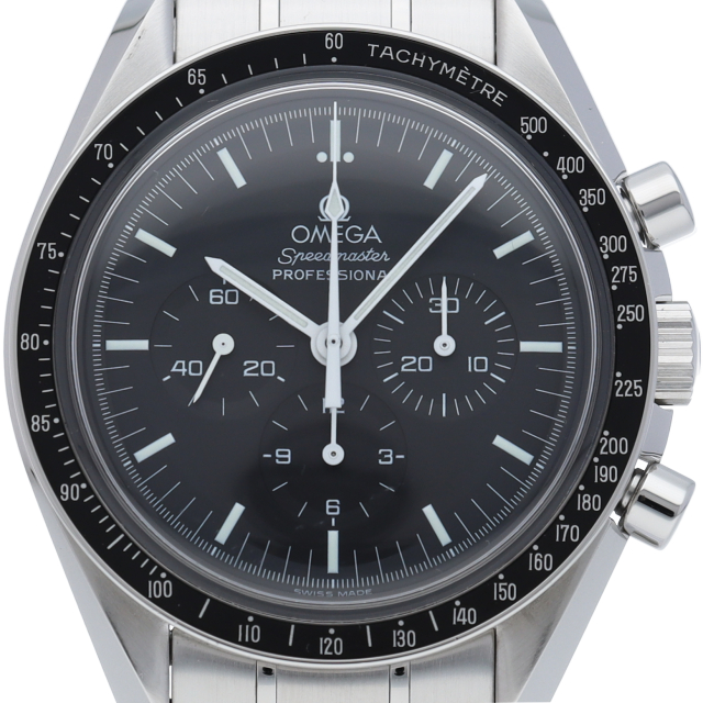 オメガを代表する人気モデルでムーンウォッチとしても有名な1本。プラ風防を使用したレトロな雰囲気と手巻ムーブメントが逆に新鮮な1本。クロノグラフ機能付。