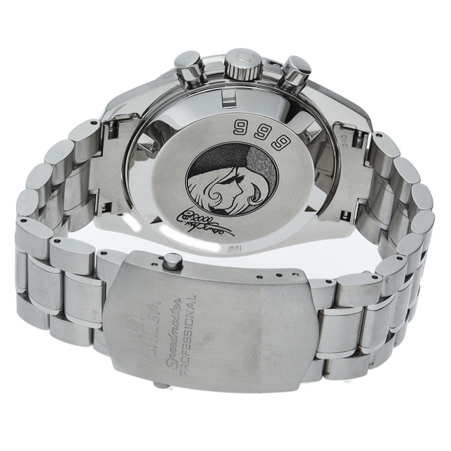 『銀河鉄道999』コラボモデルです。裏蓋には『銀河鉄道999』に登場する謎の美女・メーテルの横顔、作者・松本零士氏のサイン、限定ナンバリングの刻印があります。宇宙を旅する銀河鉄道のファンタジー性と、NASAに認められたスピードマスタープロフェッショナルの実用性が見事に昇華されたモデルと言えるでしょう。1999本限定。