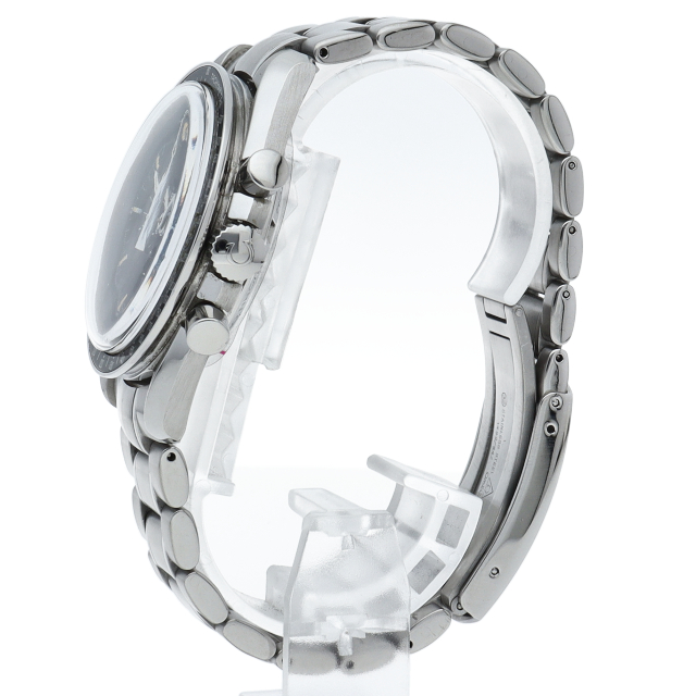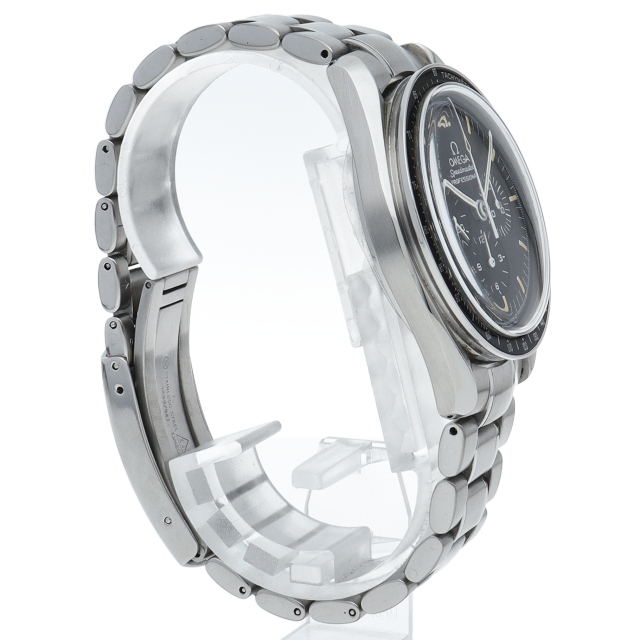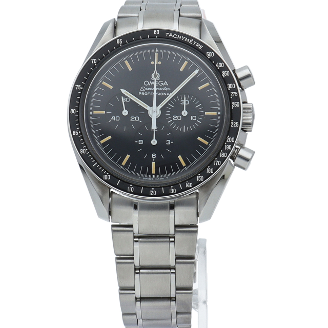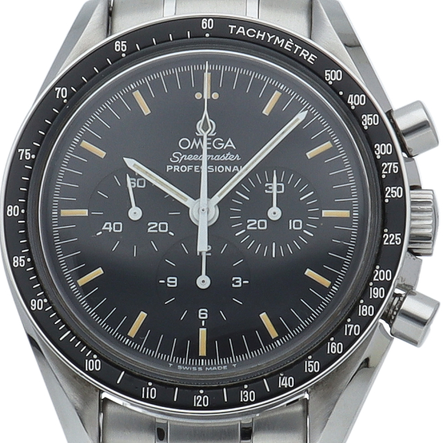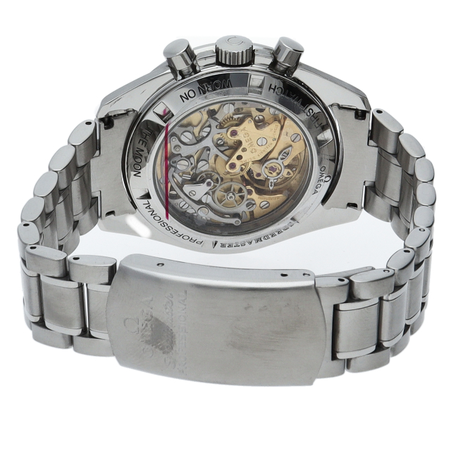 ザ・ムーンウォッチ「スピードマスター プロフェッショナル」。1996年よりRef.3570-50で親しまれたプラスチック風防のスピードマスターですが、このオメガを代表する人気モデルでムーンウォッチとしても有名な1本。シースルーバックから覗ける手巻ムーブメントが特徴的な1本。初期モデルにのみ搭載された金メッキのムーブメントを搭載しております。トリチウム文字盤。Cal.863。