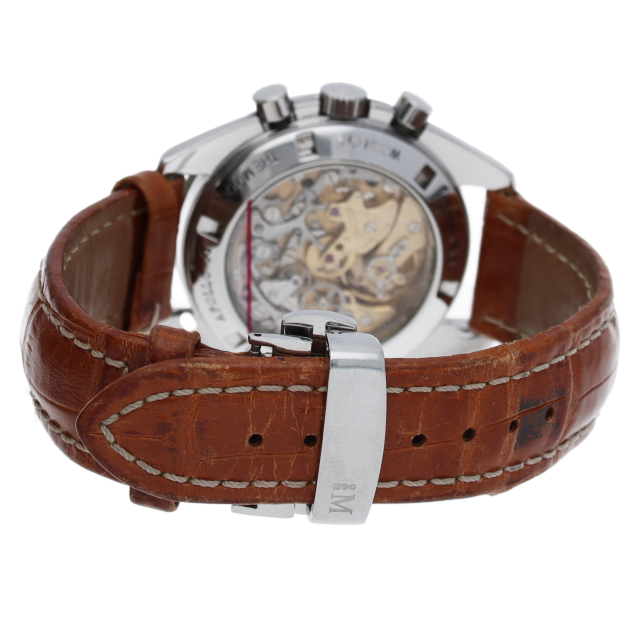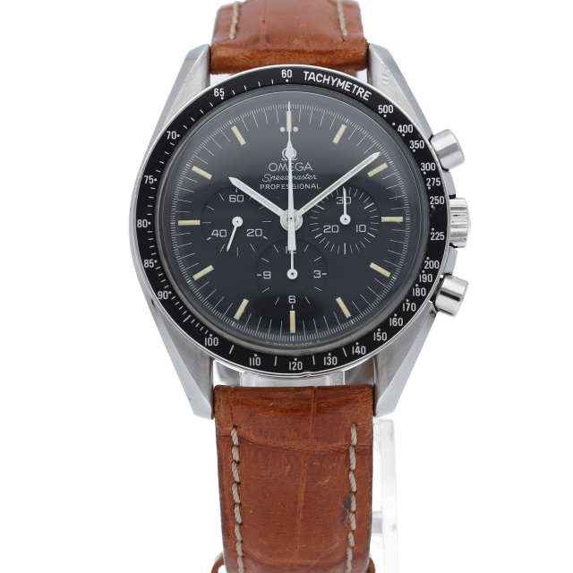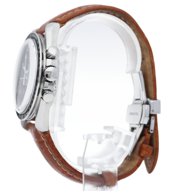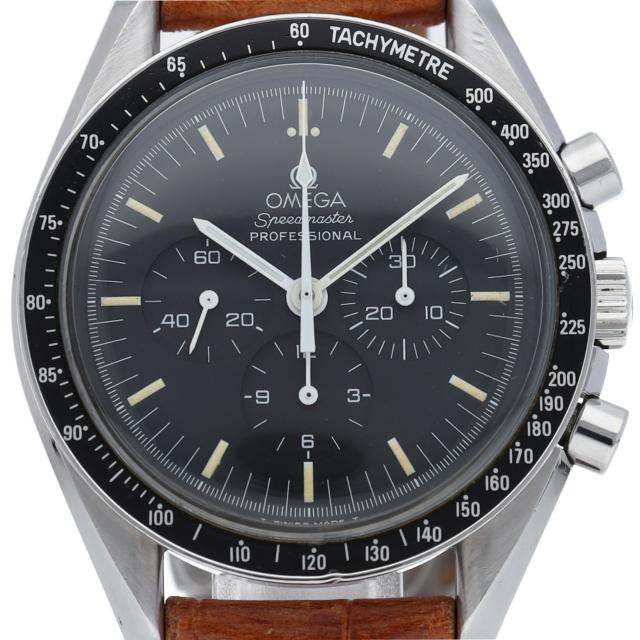 オメガを代表する人気モデルでムーンウォッチとしても有名な1本。プラ風防を使用したレトロな雰囲気とシースルーバックから覗ける手巻ムーブメントが特徴的な1本。クロノグラフ搭載。Cal.1863。