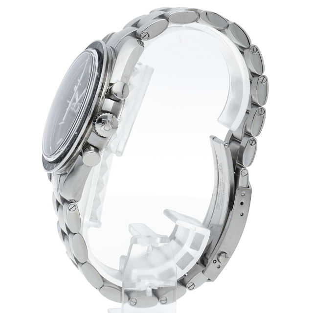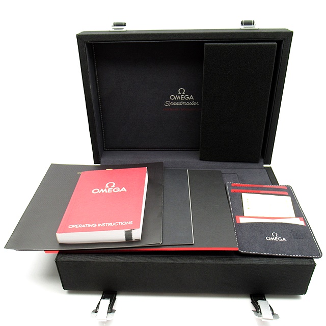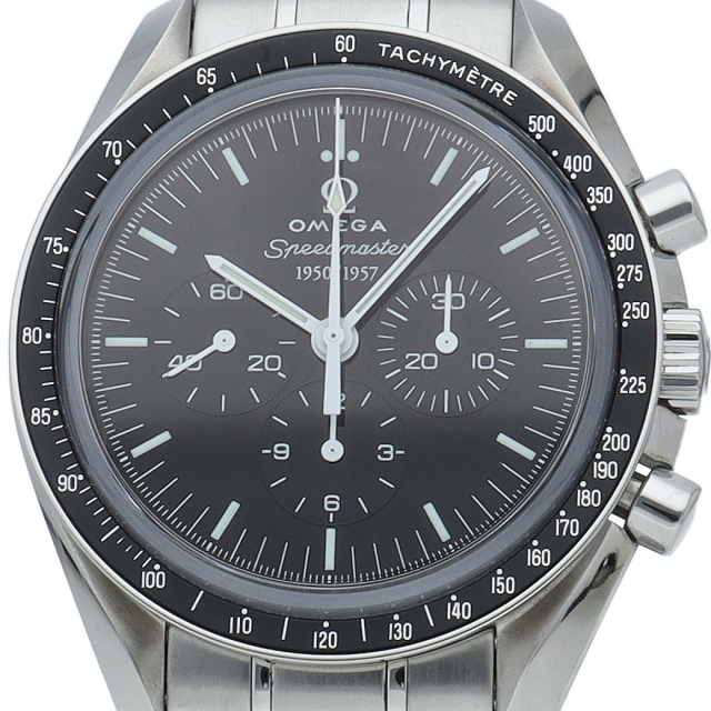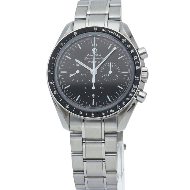 オメガを代表する人気シリーズ「スピードマスター」。スピードマスターが宇宙に挑戦し始めてから50周年を記念して発表された世界限定1957本のモデルとなります。ブラックのエナメル製ダイアルに、傷の付きにくいサファイアクリスタルガラスが特徴です。ダイアルには、スモールセコンドダイアル、30分積算計、12時間積算計が配され中央にクロノグラフ針が付属しています。