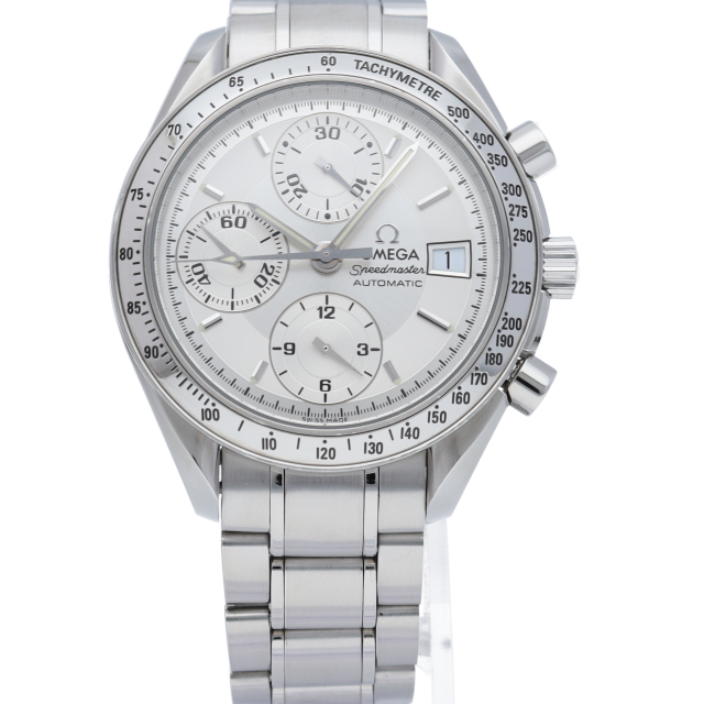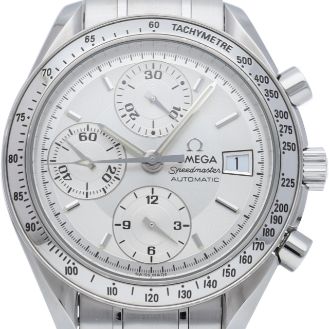オメガの代表的な人気シリーズ「スピードマスター・デイト」。クロノグラフ・デイト表示機能付きと便利で実用性のある1本です。