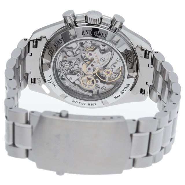 オメガを代表する人気モデルでムーンウォッチとしても有名な1本。シースルーバックから覗ける手巻ムーブメントが特徴的な1本。サファイアガラスに仕様が変更されました。クロノグラフ搭載。Cal.1863。