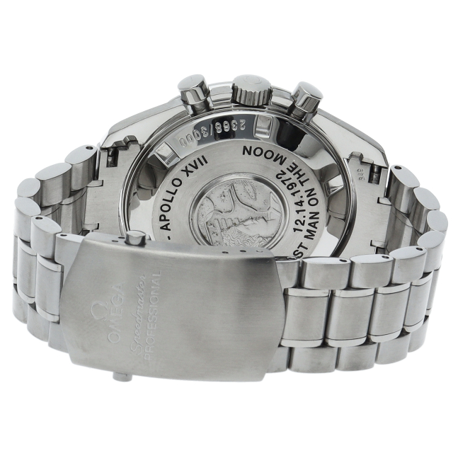 オメガのアポロ17号月面着陸30周年を記念して発売された希少な世界限定3000本の「スピードマスター プロフェッショナル」。表面のデザインは通常モデルとは違いがございませんが、裏蓋には記念刻印がされております。