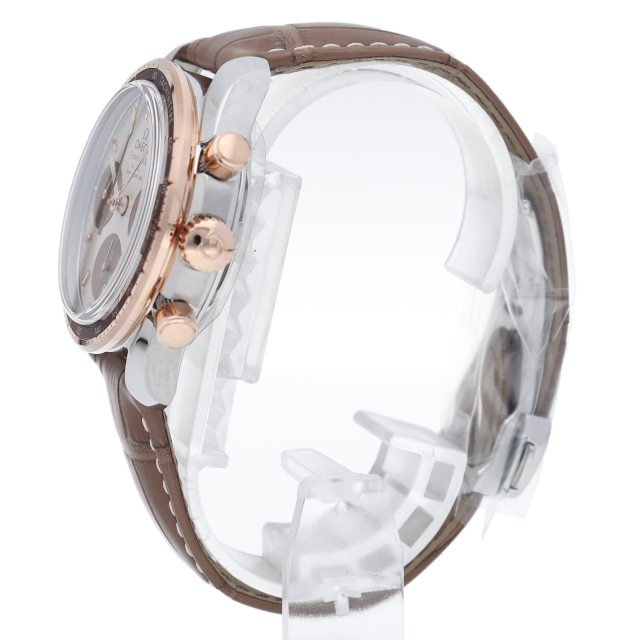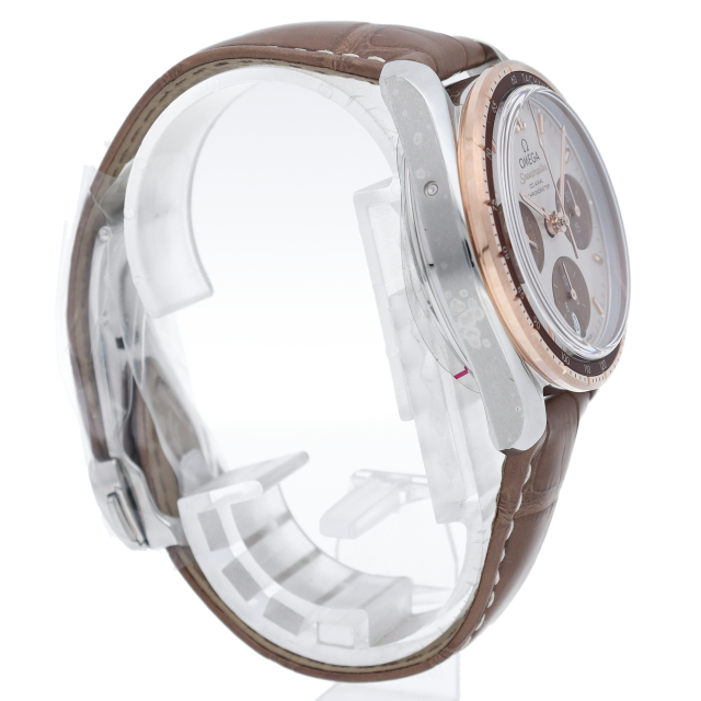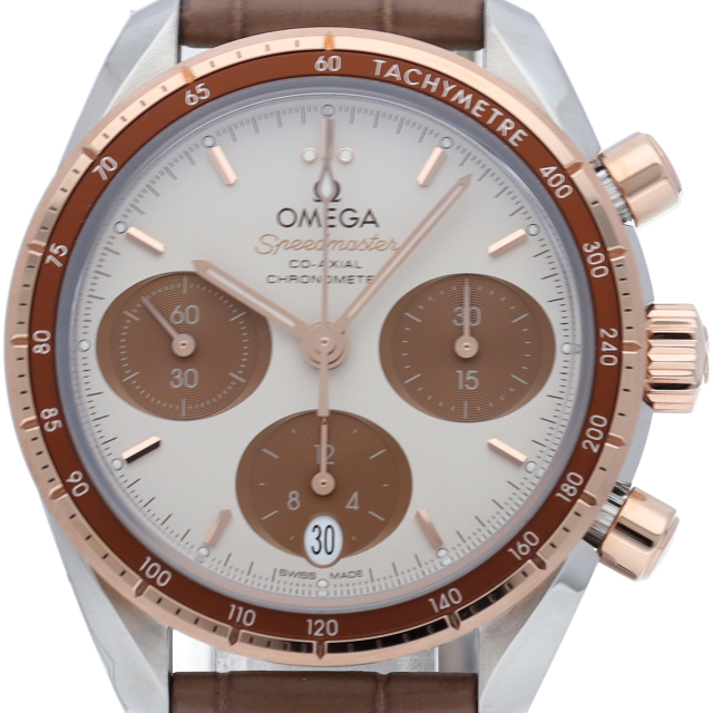 スピードマスター 38mmは、シンプルさ、サイズ感、カラーを大切にして生まれたモデル。最も有名なクロノグラフとしてのルックスと伝統もしっかりと守られています。「カプチーノ」ダイアルには横楕円型のサブダイアルを、6時位置には縦楕円型の日付窓を配しました。インデックスと針は18Kセドナゴールド製で、時針、分針、クロノグラフ秒針にはホワイトのスーパールミノヴァが塗布されています。