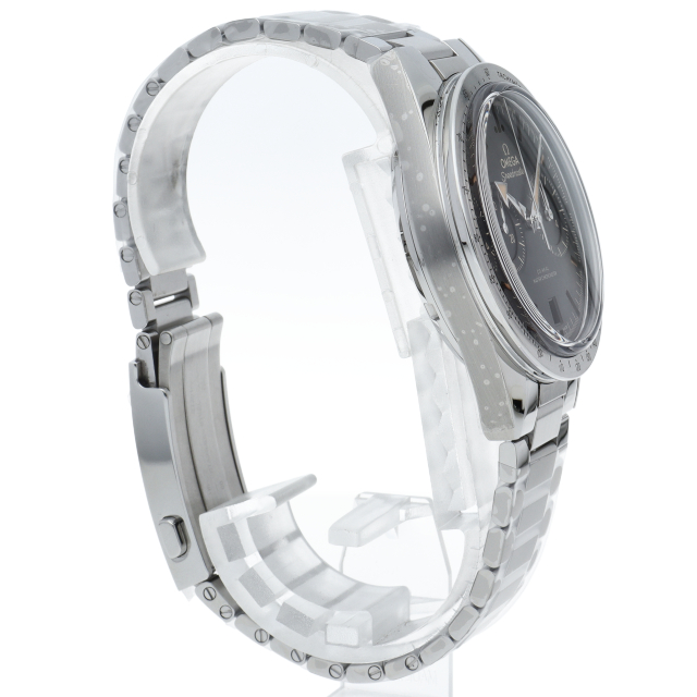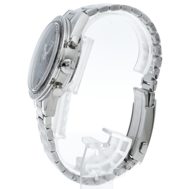 伝説的な1957年の初代スピードマスターにインスピレーションを受けたこのモデルは、ステンレススティール製ケースとブラックのダイアル、ヴィンテージ スーパールミノヴァが塗布された凹型のインデックスを備えています。ロジウム仕上げの「ブロードアロー」針、6時位置に日付表示、9時位置にスモールセコンド、3時位置には12時間と60分の同軸積算計のサブダイアルが配置されています。