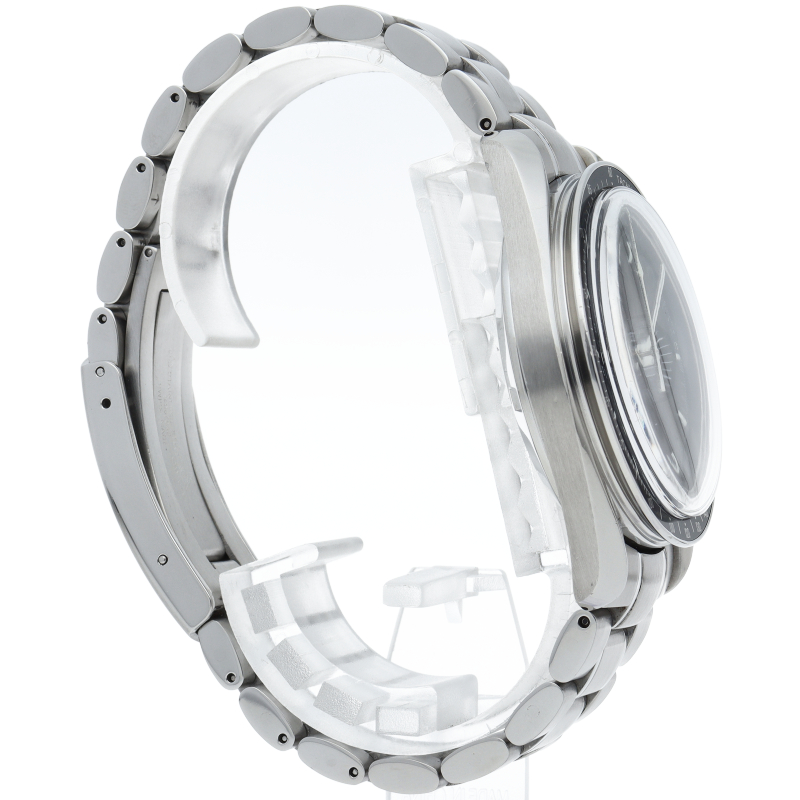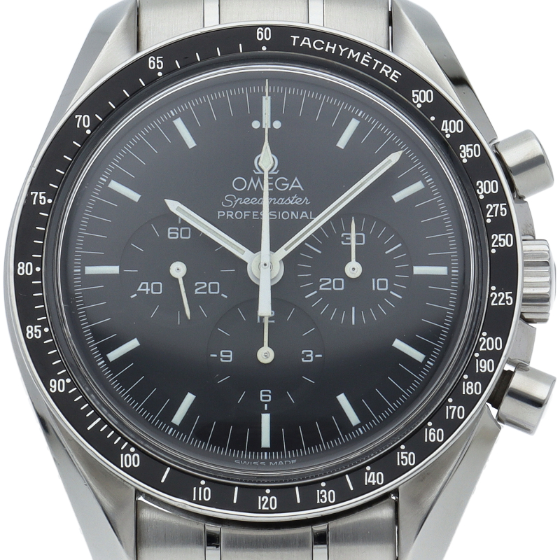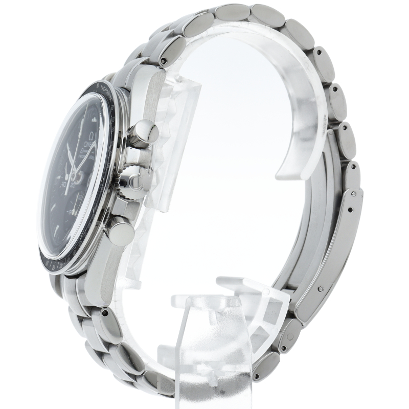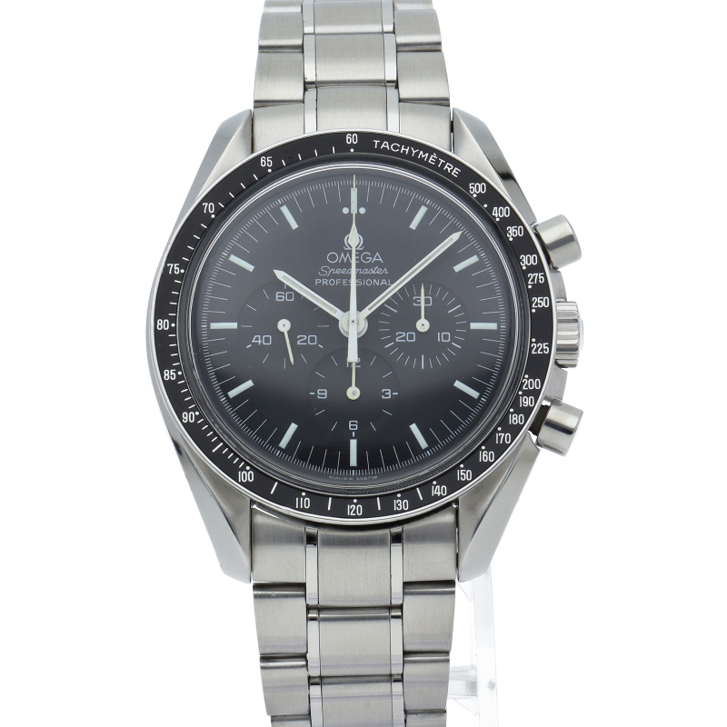 オメガを代表する人気モデルでムーンウォッチとしても有名な1本。こちらは9999本限定のアポロ月面着陸記念モデルです。裏蓋には月面に降り立つイーグルが刻印されています。手巻ムーブメントが逆に新鮮な1本。クロノグラフ機能付。