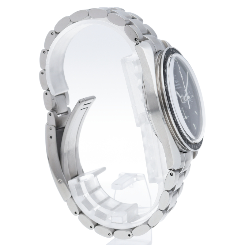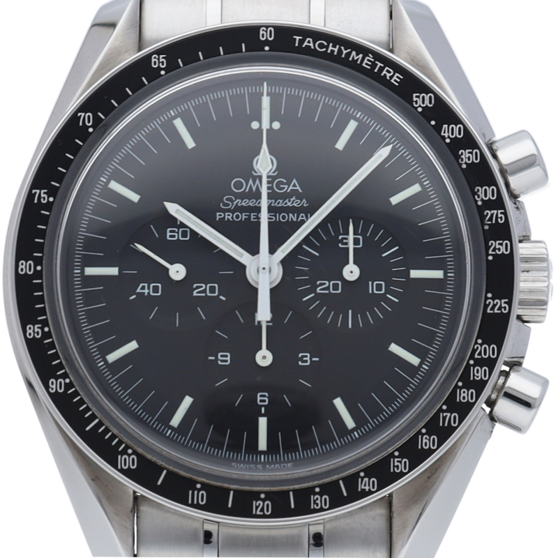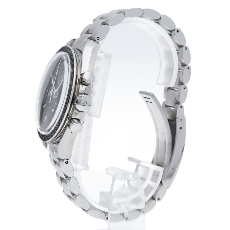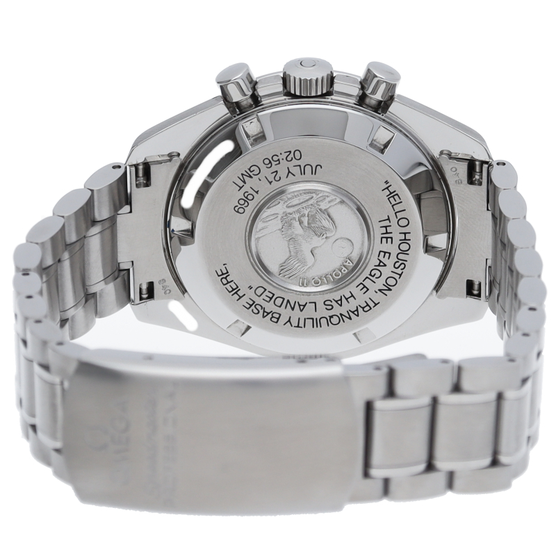 オメガを代表する人気モデルでムーンウォッチとしても有名な1本。こちらは9999本限定のアポロ月面着陸記念モデルです。裏蓋には月面に降り立つイーグルが刻印されています。手巻ムーブメントが逆に新鮮な1本。クロノグラフ機能付。