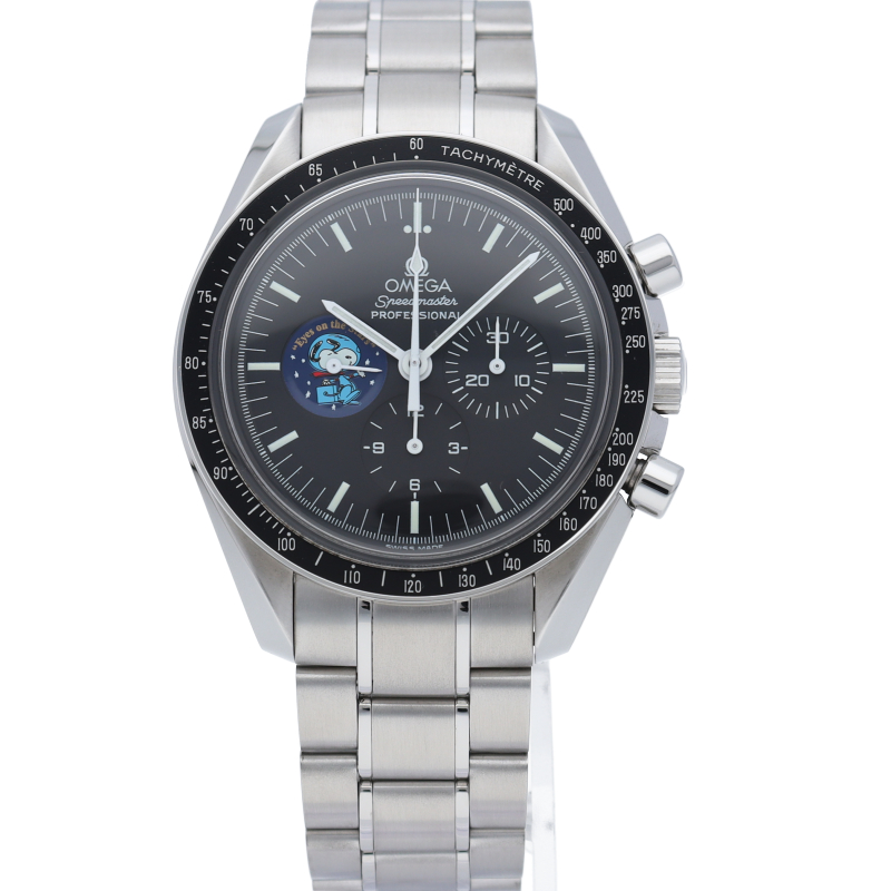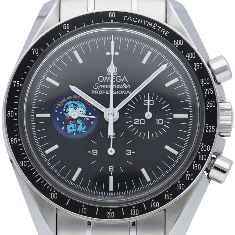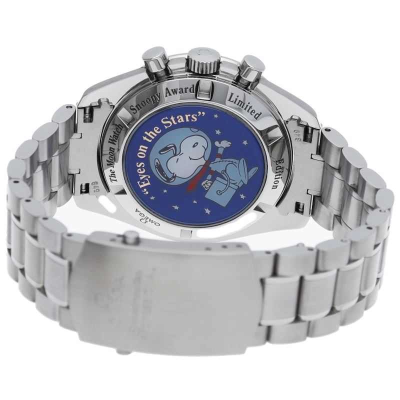 アポロ13号の名誉を称え「スピードマスター」はNASAから宇宙探査計画に貢献した企業や個人に贈られる名誉賞「スヌーピー賞」を贈られたことにちなんで生産された限定モデルです。9時位置のインダイヤルと裏蓋にスヌーピーが描かれています。世界限定5441本。