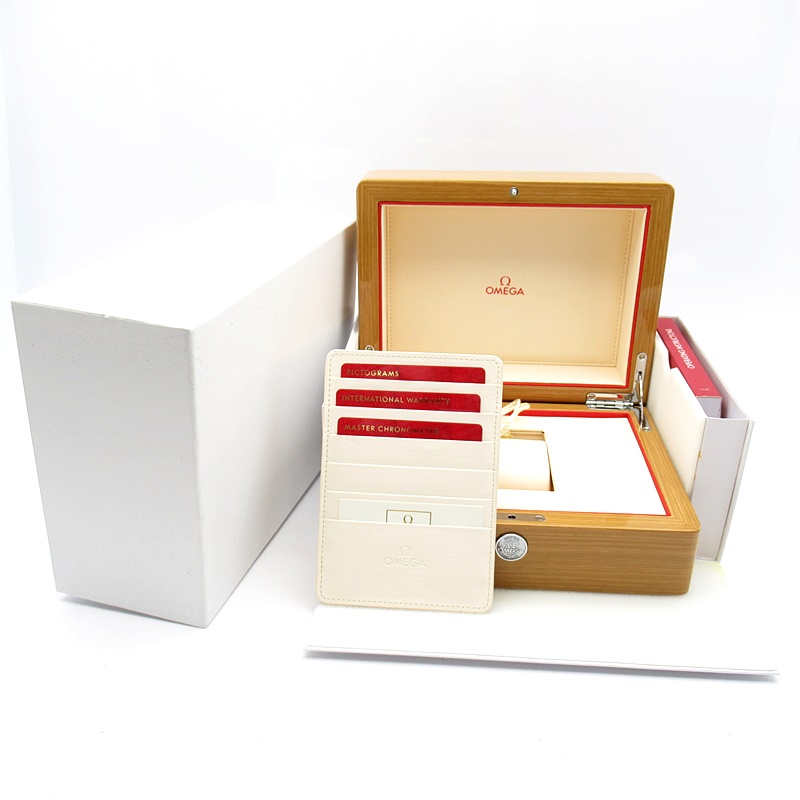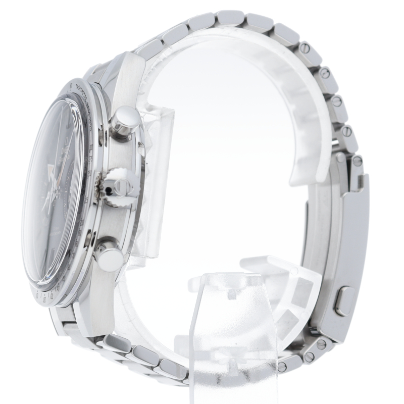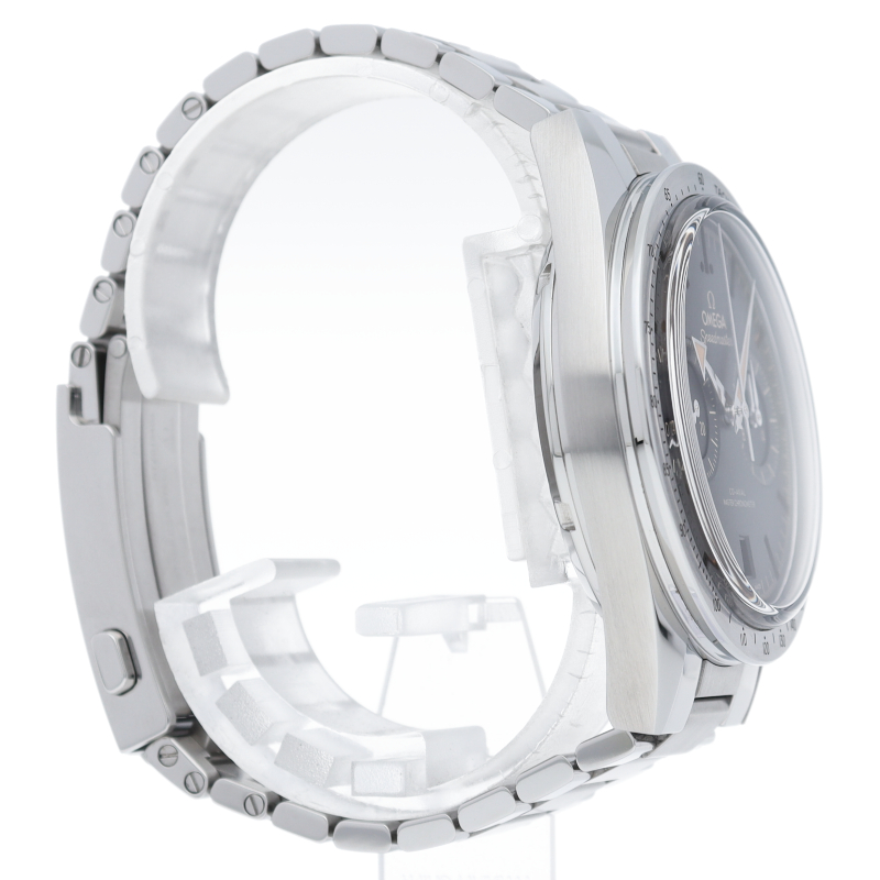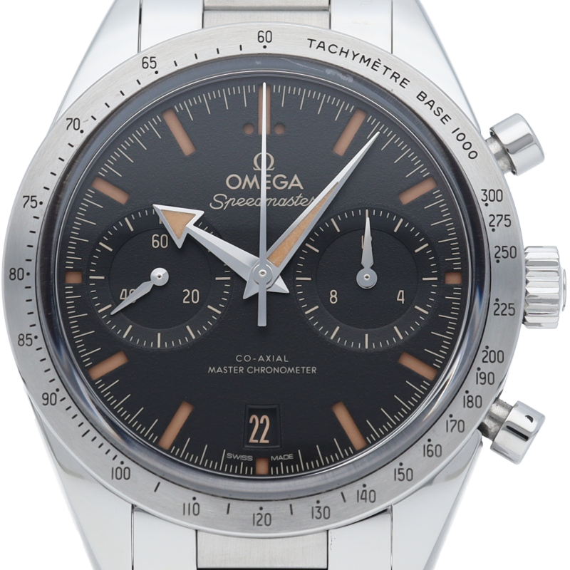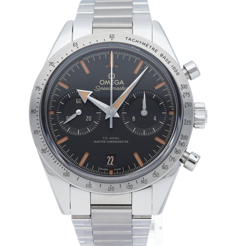 伝説的な1957年の初代スピードマスターにインスピレーションを受けたこのモデルは、ステンレススティール製ケースとブラックのダイアル、ヴィンテージ スーパールミノヴァが塗布された凹型のインデックスを備えています。ロジウム仕上げの「ブロードアロー」針、6時位置に日付表示、9時位置にスモールセコンド、3時位置には12時間と60分の同軸積算計のサブダイアルが配置されています。