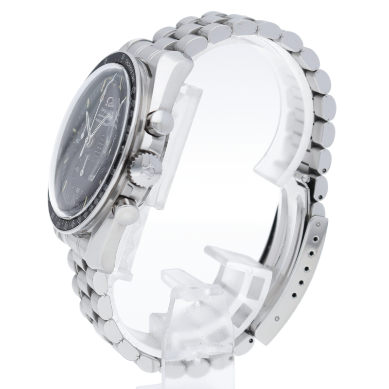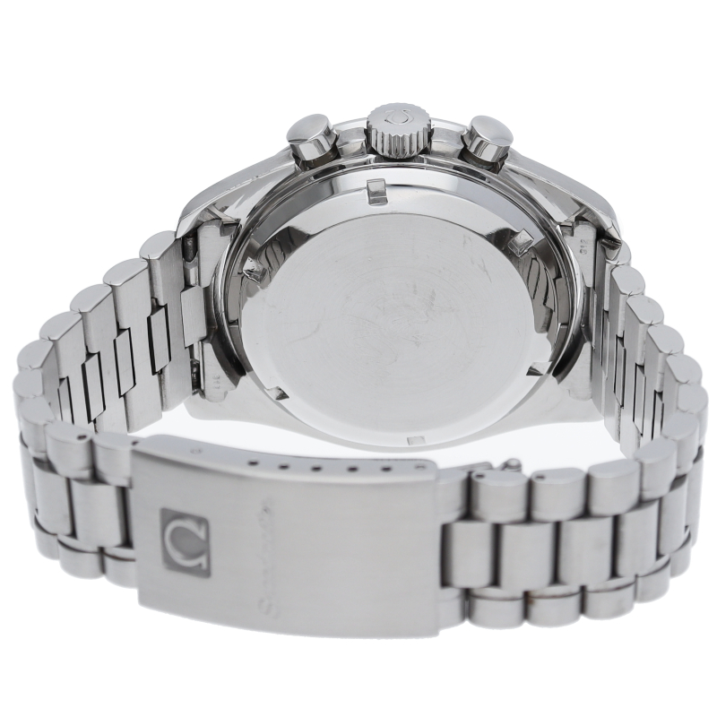オメガを代表する人気モデルでムーンウォッチとしても有名な1本。プラ風防を使用したレトロな雰囲気と手巻ムーブメントが逆に新鮮な1本。クロノグラフ機能付。文字盤のスピードマスターの表記が下がりR仕様です。