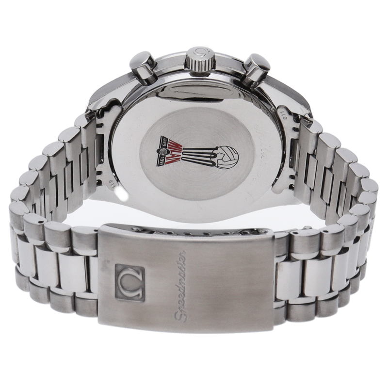 1999年に名門ACミラン設立100周年を記念して製造されたスピードマスターです。 バックケースには「1889-1999」の年号が入れられており、ダイヤルにも赤文字でプリントされています。 こちらは世界限定1999本のリミテッドモデルです。