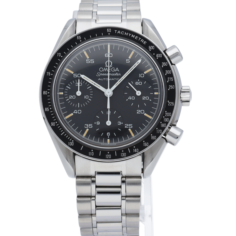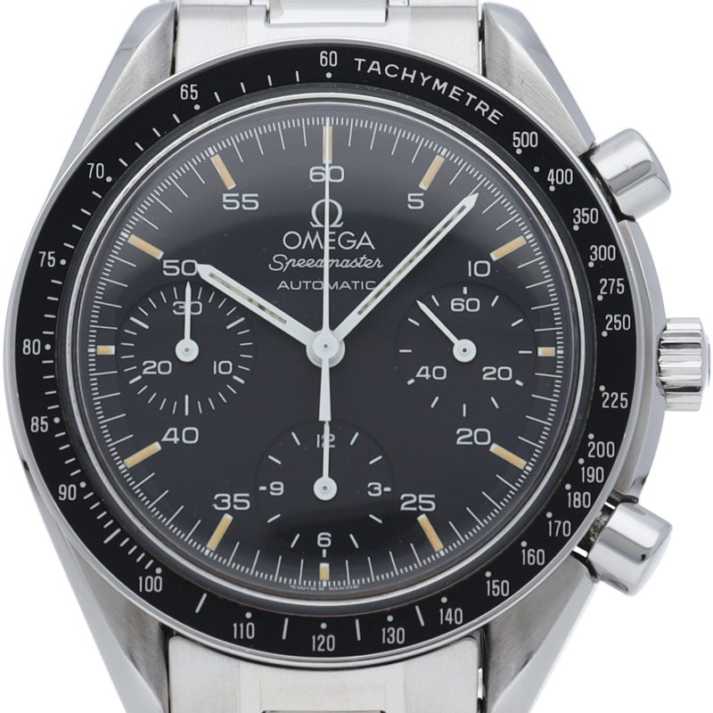 オメガを代表する人気シリーズ「スピードマスター」。プラ風防を使用したレトロな雰囲気かつシンプルにまとまったデザインがスタイルを選ばずにご使用いただけます。