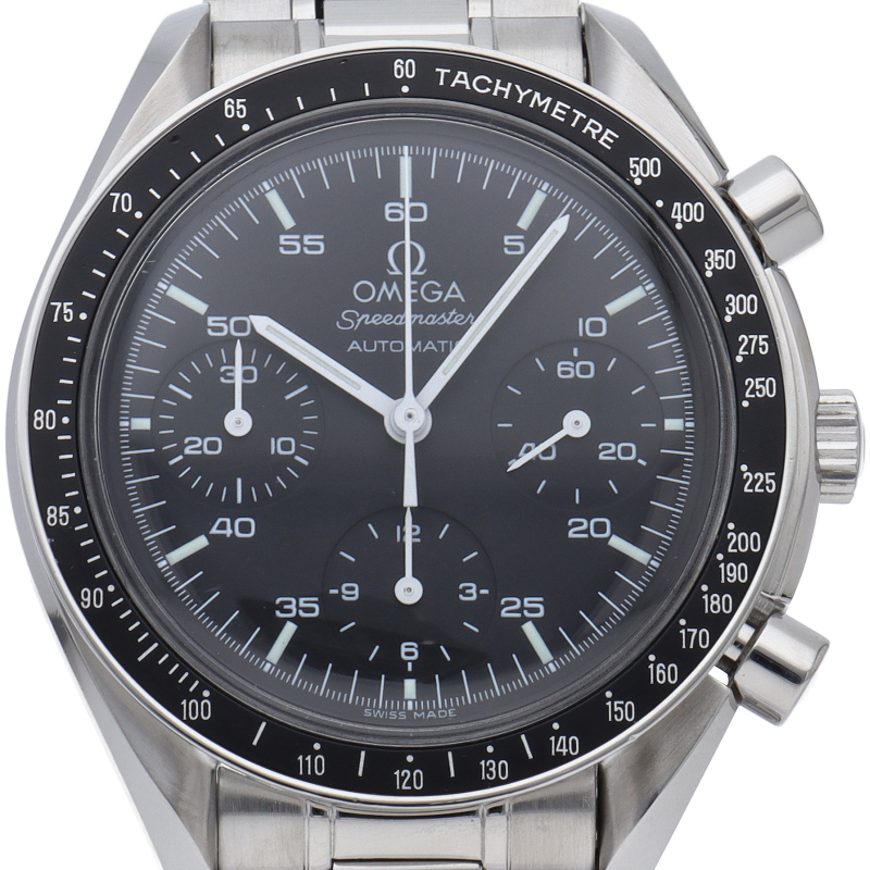 オメガを代表する人気シリーズ「スピードマスター」。プラ風防を使用したレトロな雰囲気かつシンプルにまとまったデザインがスタイルを選ばずにご使用いただけます。