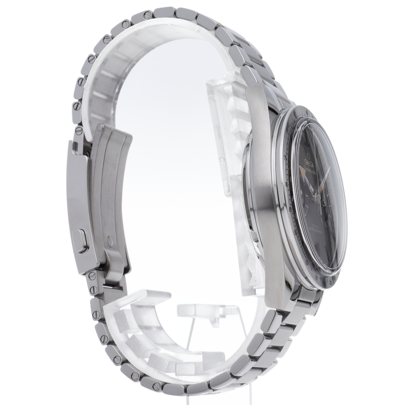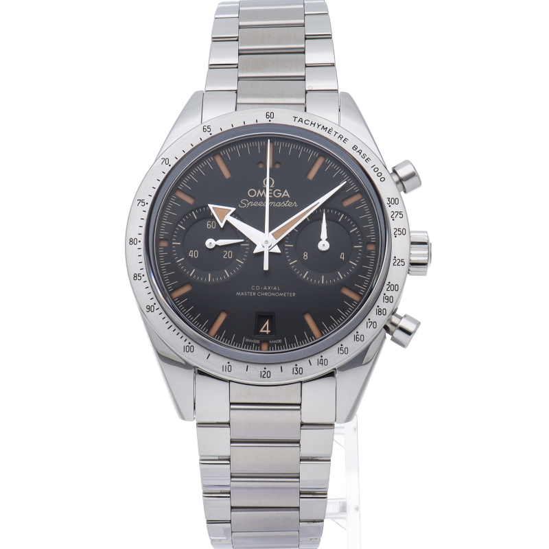 伝説的な1957年の初代スピードマスターにインスピレーションを受けたこのモデルは、ステンレススティール製ケースとブラックのダイアル、ヴィンテージ スーパールミノヴァが塗布された凹型のインデックスを備えています。ロジウム仕上げの「ブロードアロー」針、6時位置に日付表示、9時位置にスモールセコンド、3時位置には12時間と60分の同軸積算計のサブダイアルが配置されています。